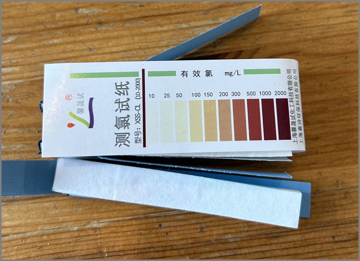(By lab, I mean on the workbench in the shop.) I spent some real money and ordered high concentration free chlorine test strips (since that is what does all the heavy lifting in bleach). The strips work by changing color based on the concentration and you match that up to a scale on the reference table. Its easy and why the technique is used throughout industry.