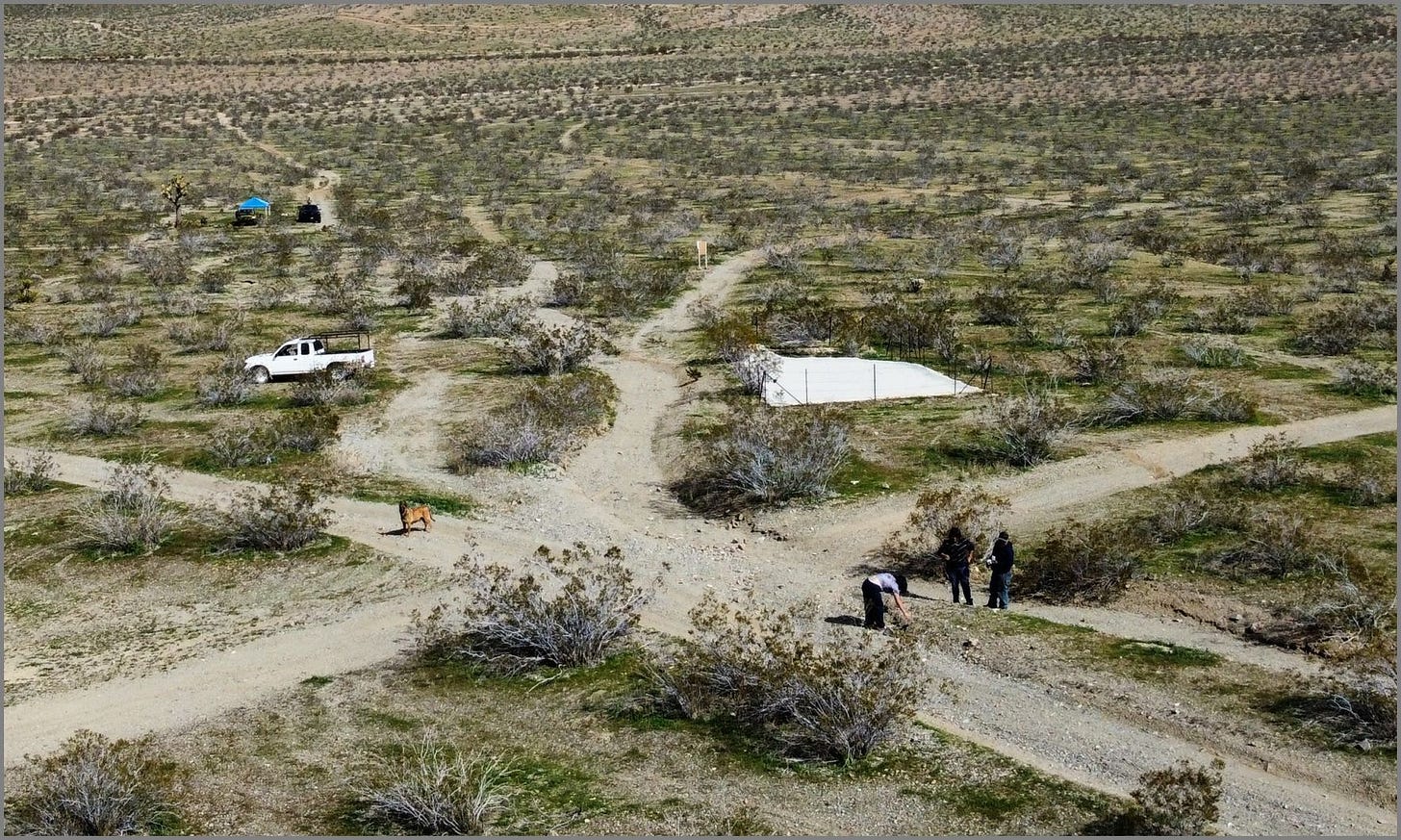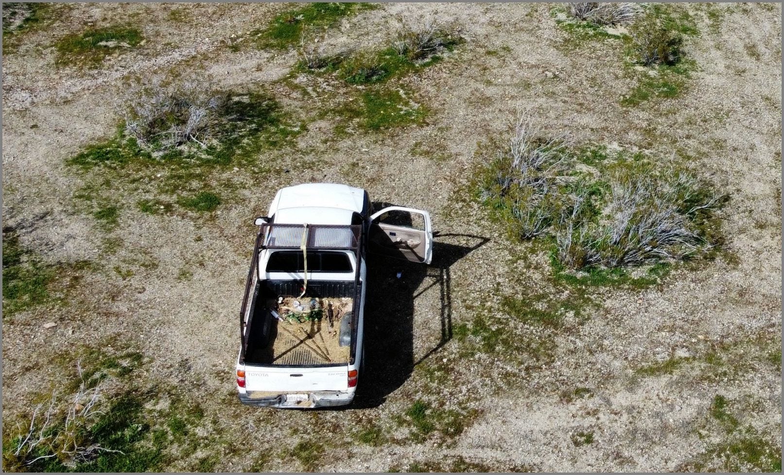 After I flew over them at 200’ I descended and took a photo of the overall layout of people and vehicles. Our camp is in the distance under the blue canopy, 100 yard target dead center, people and one of the dogs – definitely a potential threat.